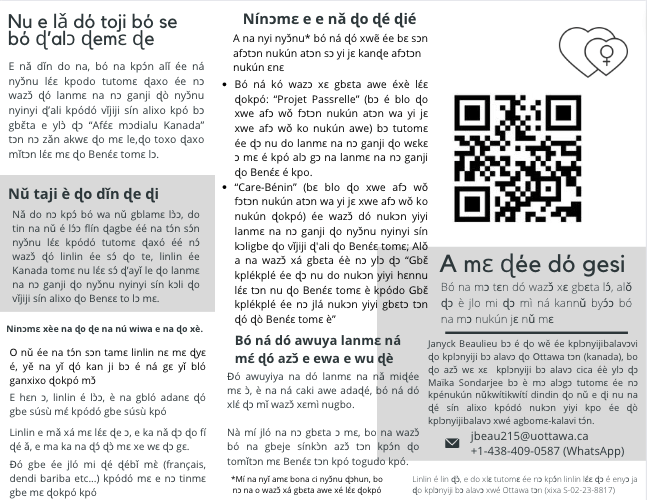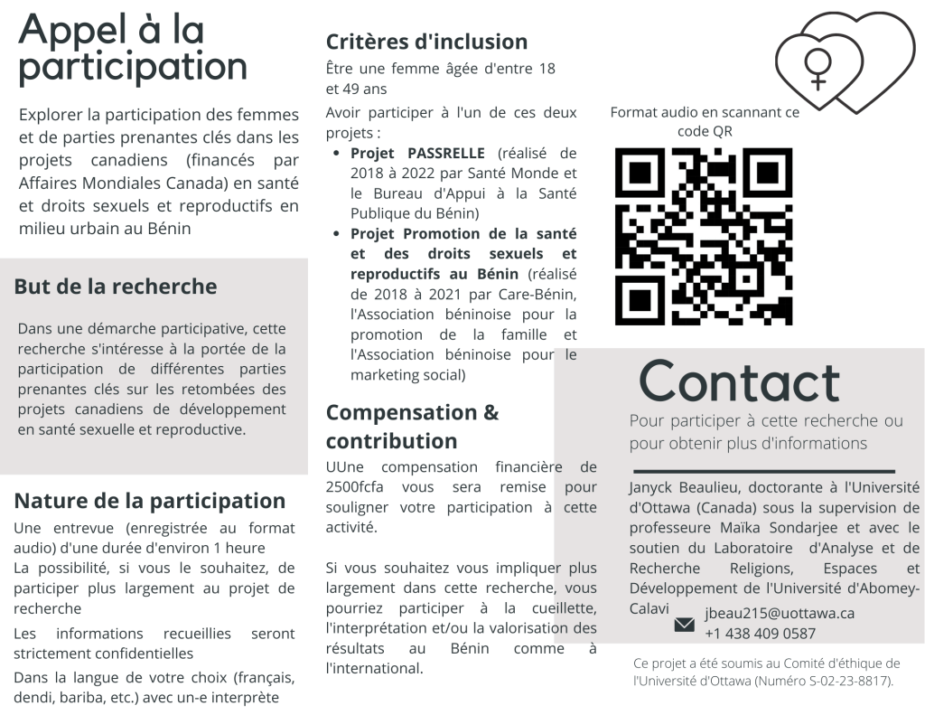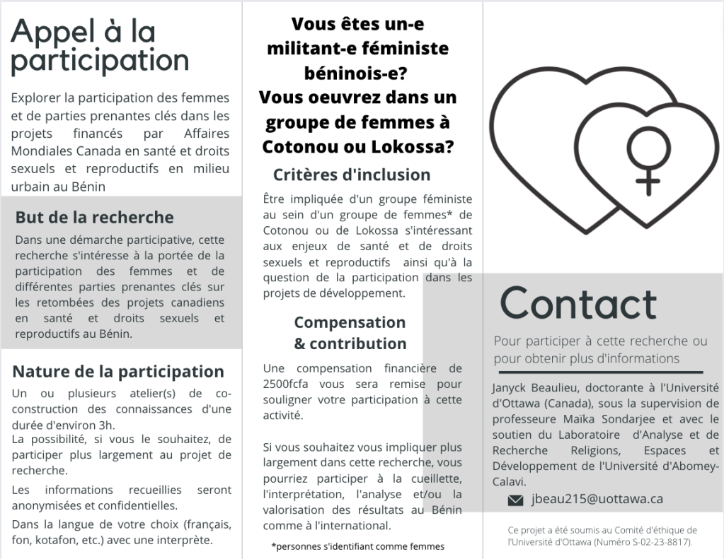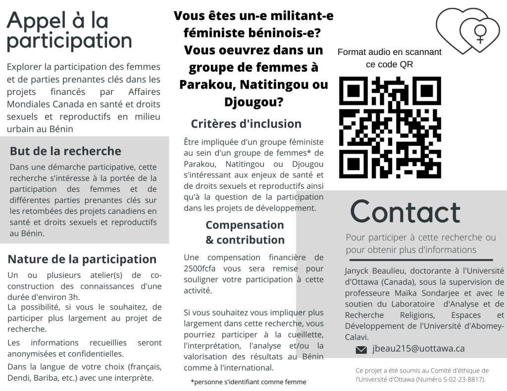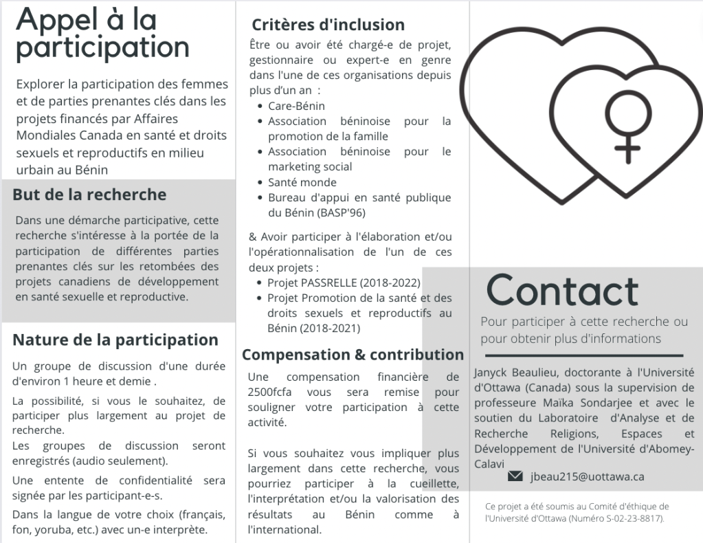 Projet de recherche : Explorer la participation des femmes et de parties prenantes clés dans les projets financés par Affaires Mondiales Canada et ses retombées depuis la Politique d’aide internationale féministe : le cas des projets en santé et droits sexuels et reproductifs en milieu urbain au Bénin