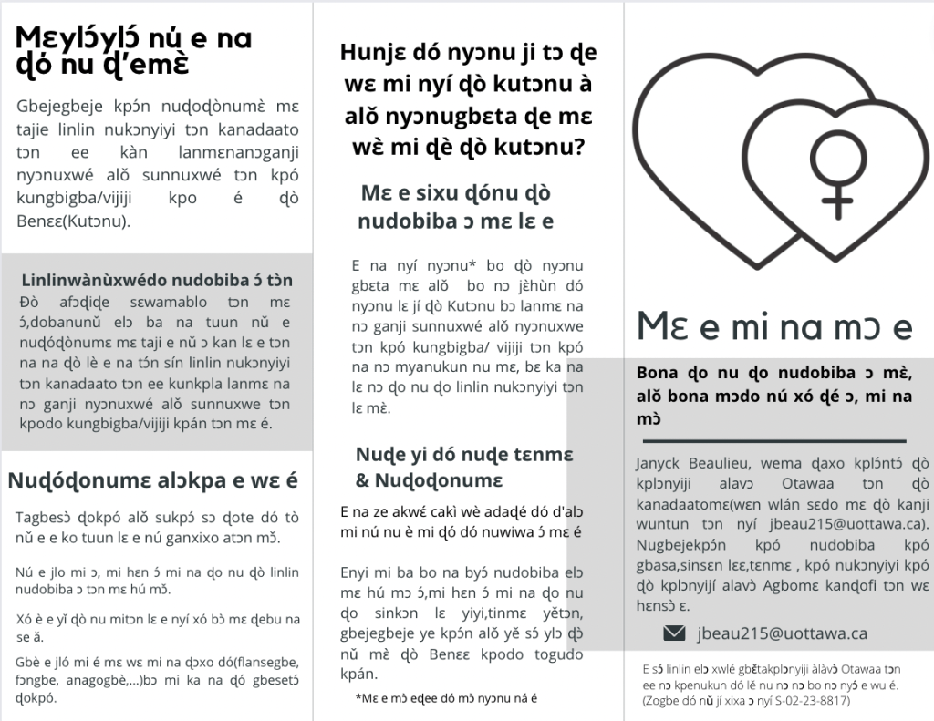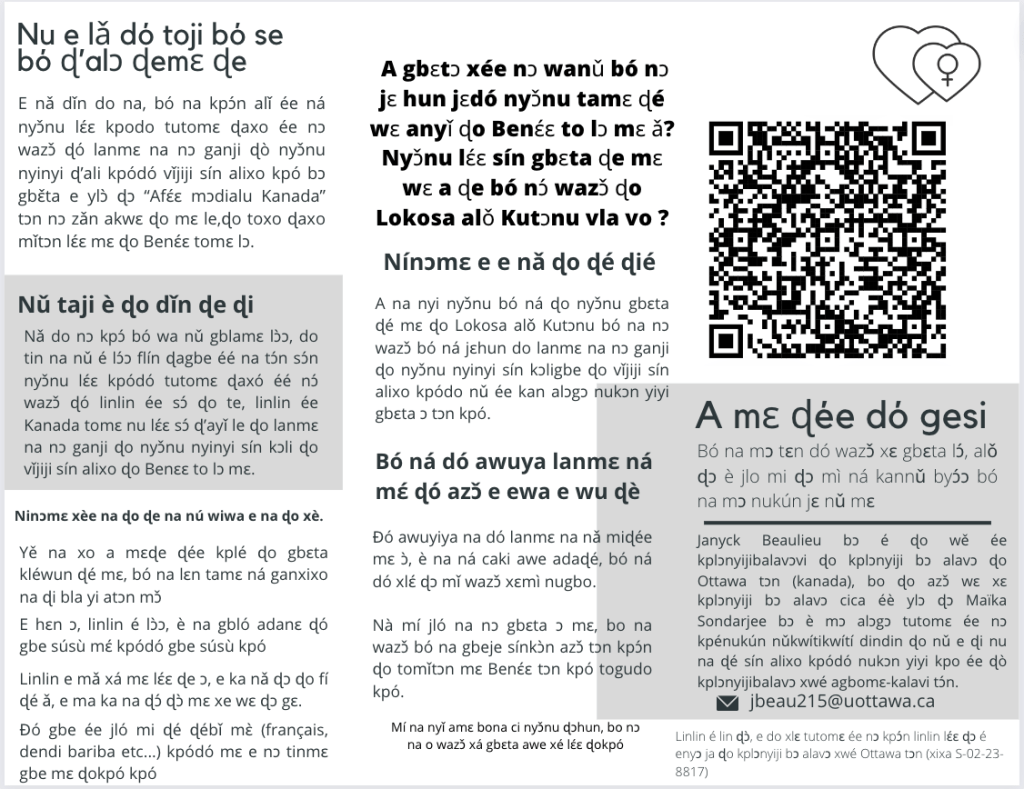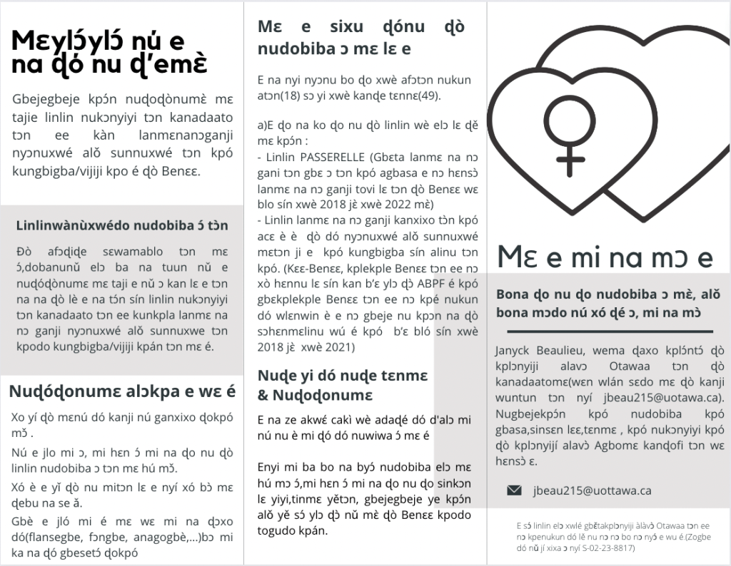 Avec la participation d’organisations partenaires béninoises et canadiennes (ABMS, ABPF, Care-Bénin, Santé Monde et BASP’96) et de militantes féministes béninoises oeuvrant en santé sexuelle et reproductive. Avec le soutien du Dr.Amouzouvi du Laboratoire d’Analyse et de Recherche Religions, Espaces et Développement de l’Université d’Abomey-Calavi.