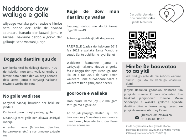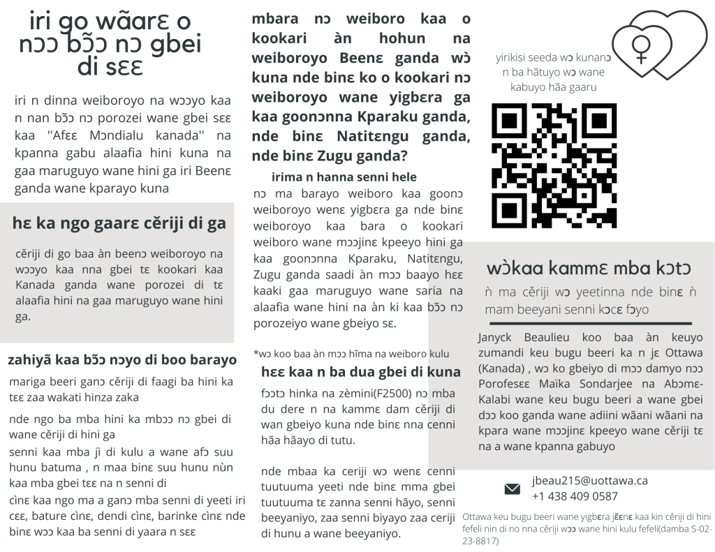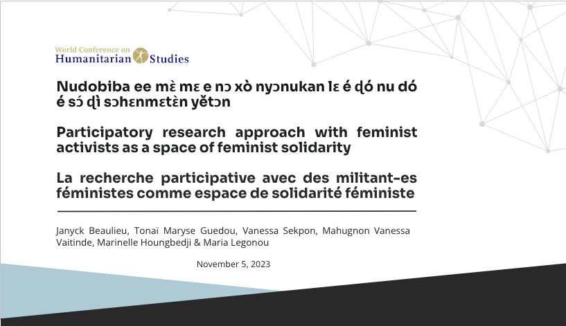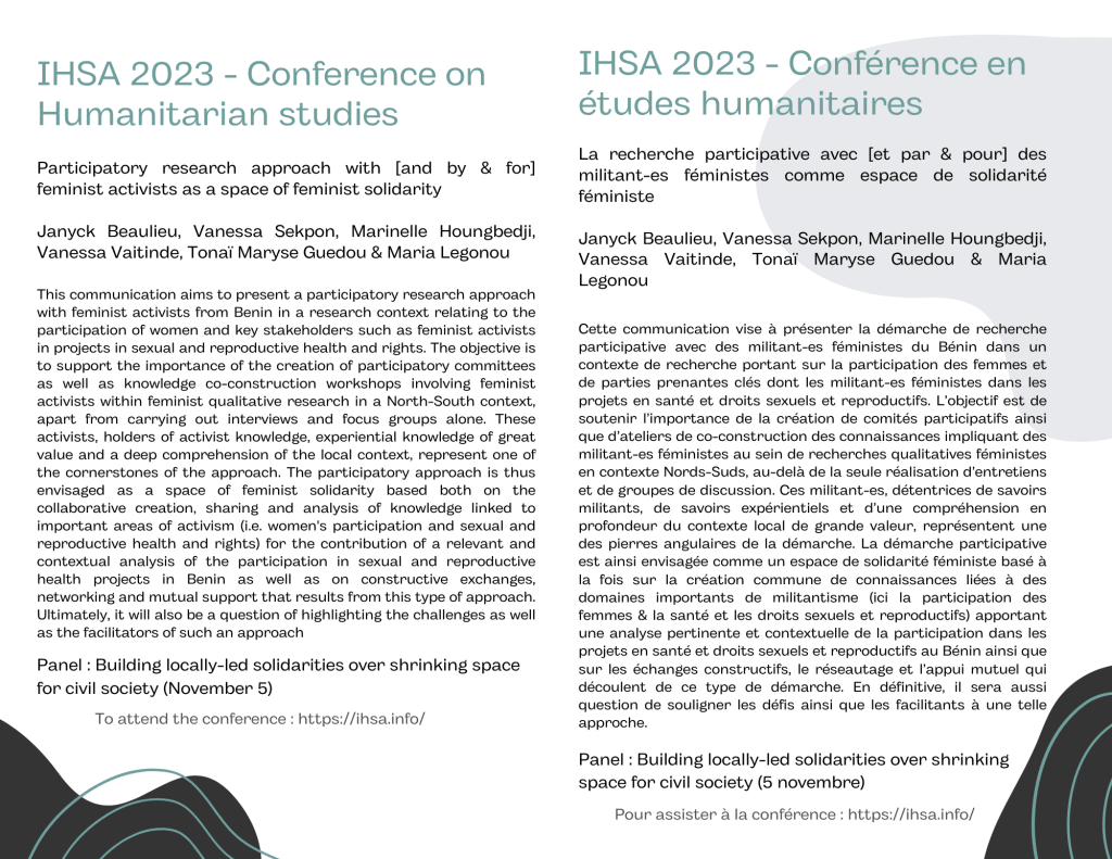 À partir d’une méthodologie féministe, qualitative et participative-partenariale et d’un cadre théorique féministe critique, cette recherche se penche sur la question de la participation des femmes et de parties prenantes clés (notamment les militant-es féministes béninoises) dans des projets en santé et droits sexuels et reproductifs (SDSR) financés par le bailleur de fonds canadien Affaires mondiales Canada au Bénin et les liens qui pourraient exister entre la dimension participative et les effets sur la SDSR. De plus, elle se penche aussi sur la positionnalité et les questions d’éthique en tant que chercheure féministe des Nords dans un contexte de recherche Nords-Suds.