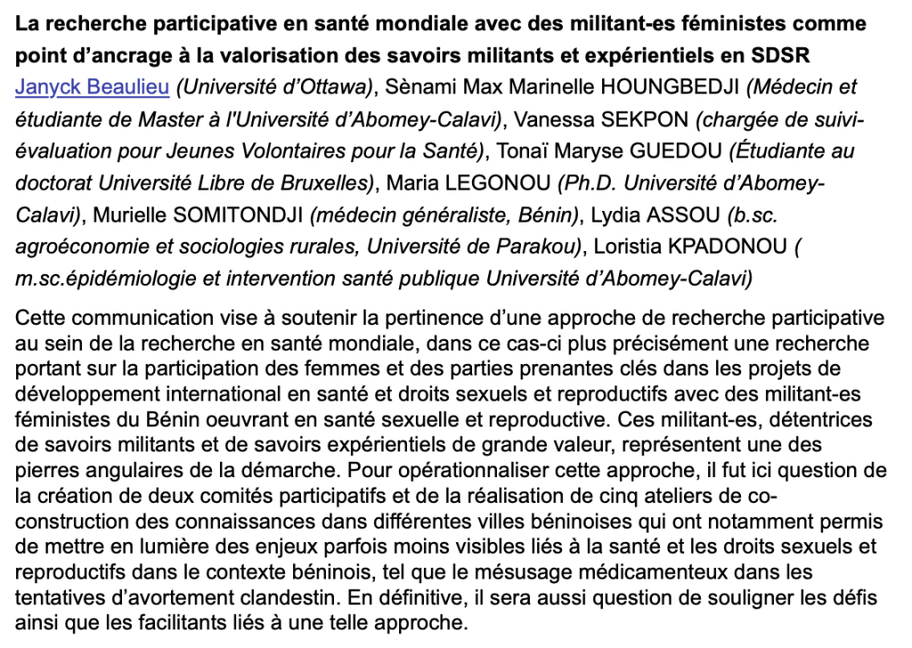 i) Acfas mai 2024 – Colloque en santé mondiale de l’Institut Santé et Société